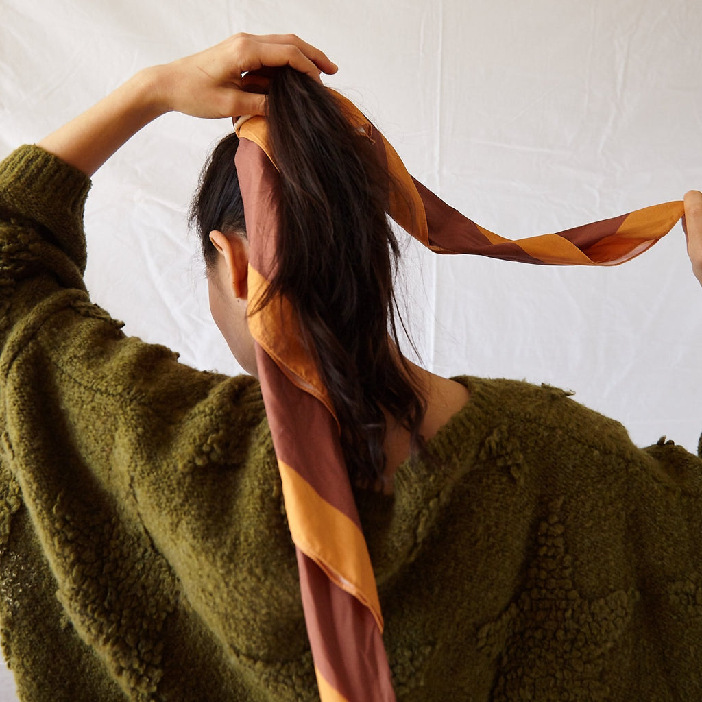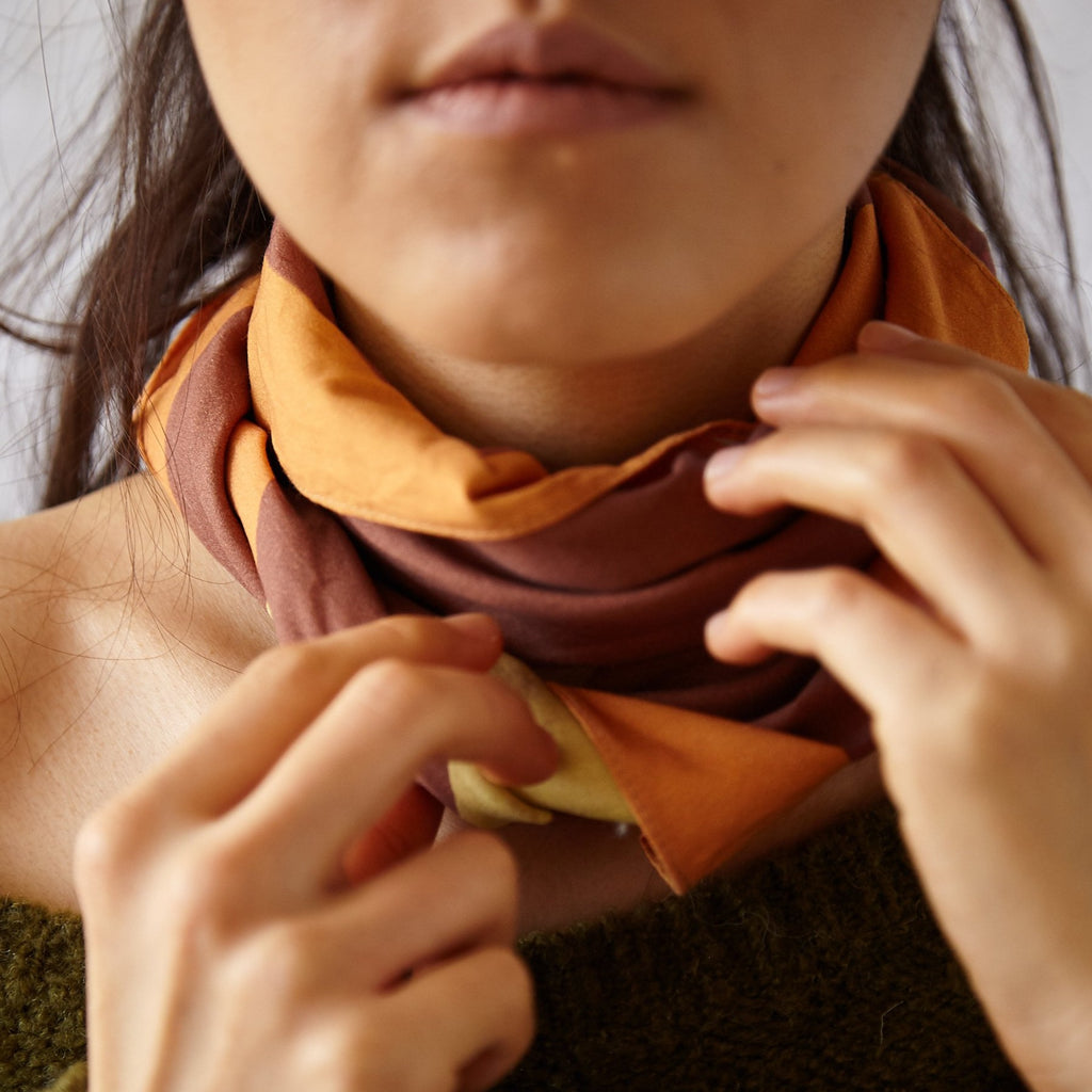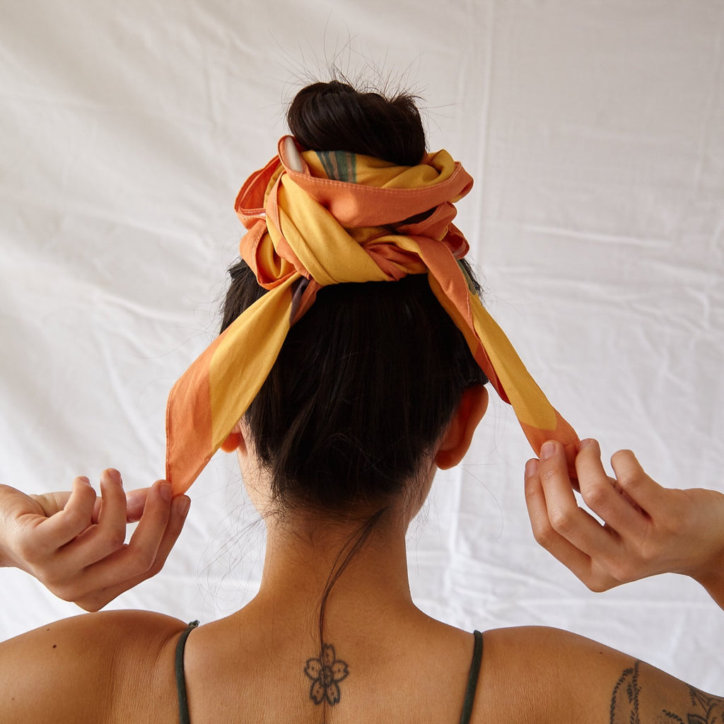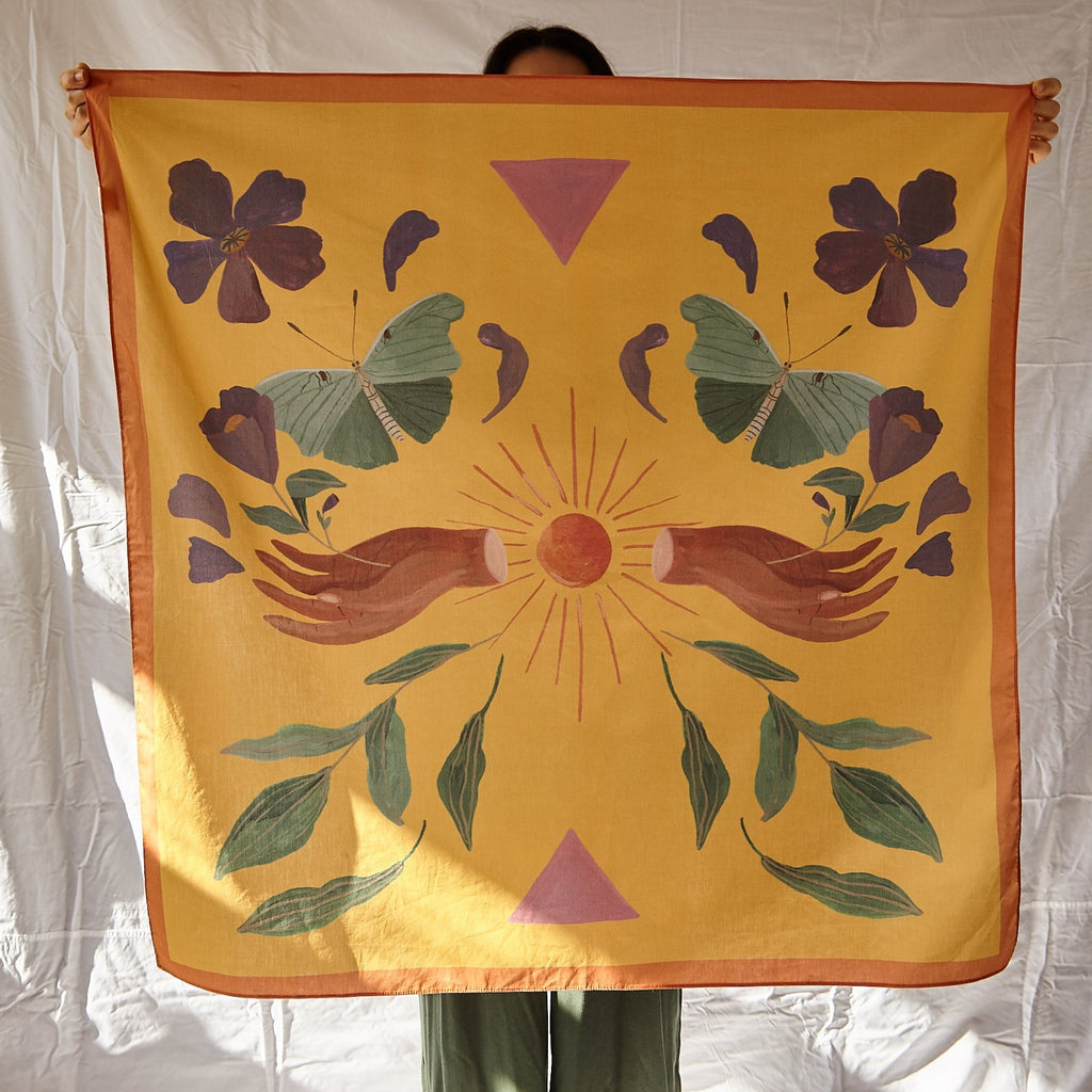Project TrêsThe Karen scarf showcases a vibrant mix of floral prints, leaves, and other illustrative elements. Designed by Karen Suehiro, the piece comes in two color patterns. One with a fresh color palette and another one with warm tones. This piece is crafted from cotton and has a soft feel, making it easy to style. Its style is playful and elegant, and its fabrication process echoes Project Três's ethical principles. It can also be used as a decor piece.