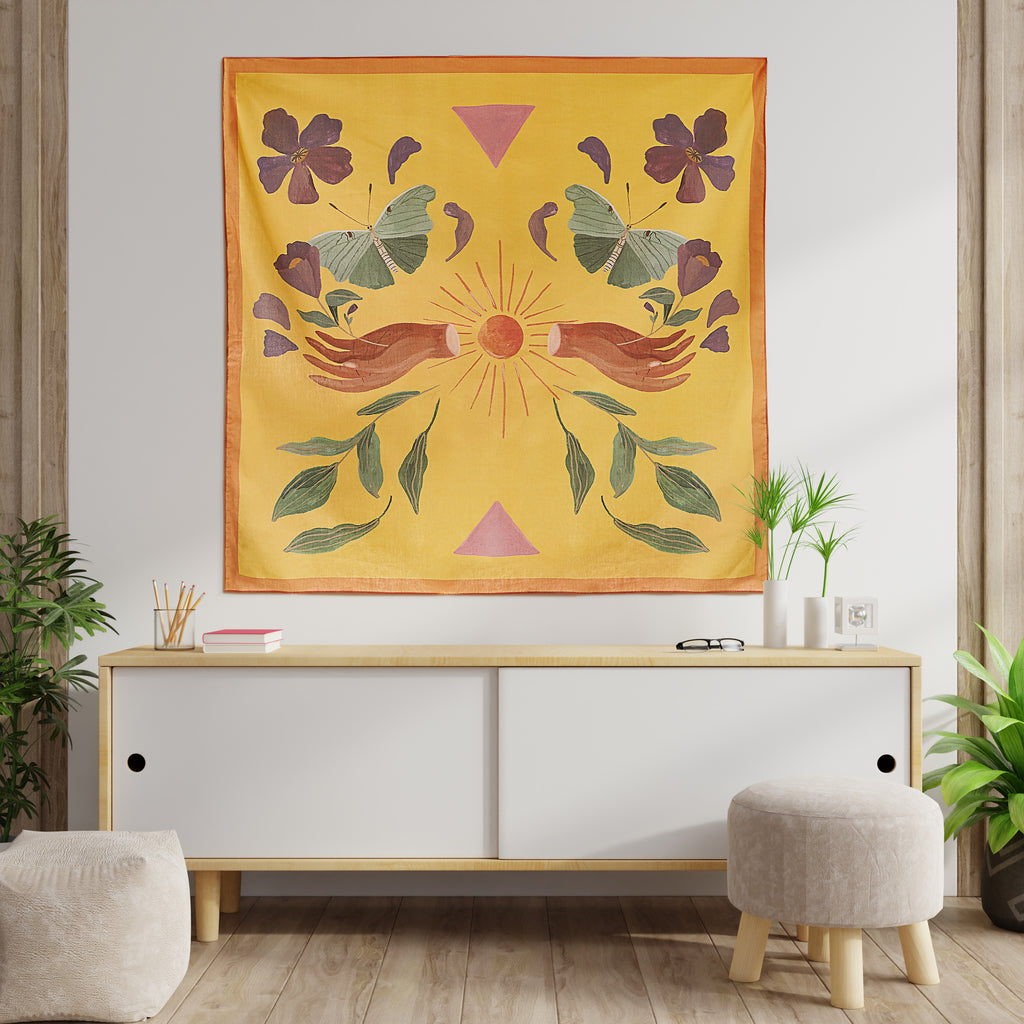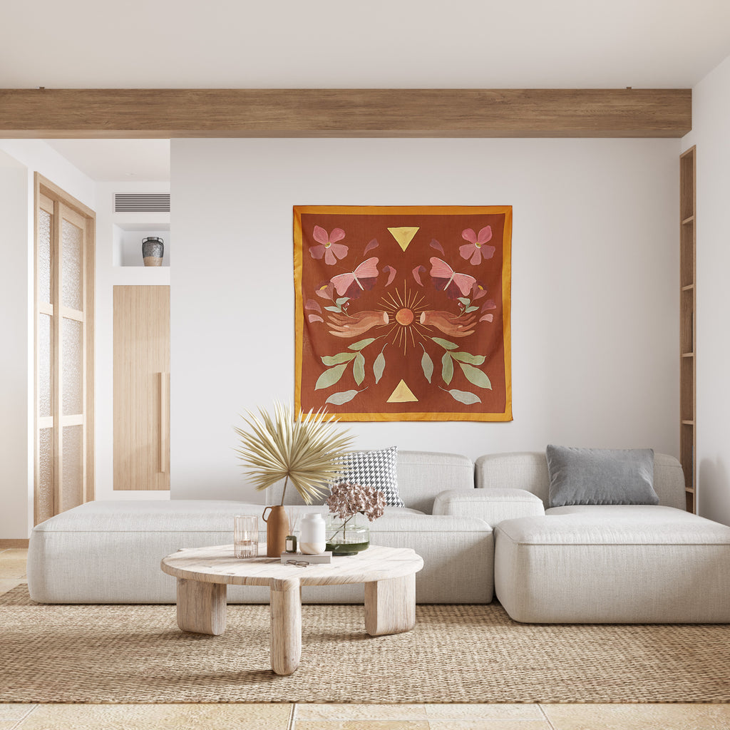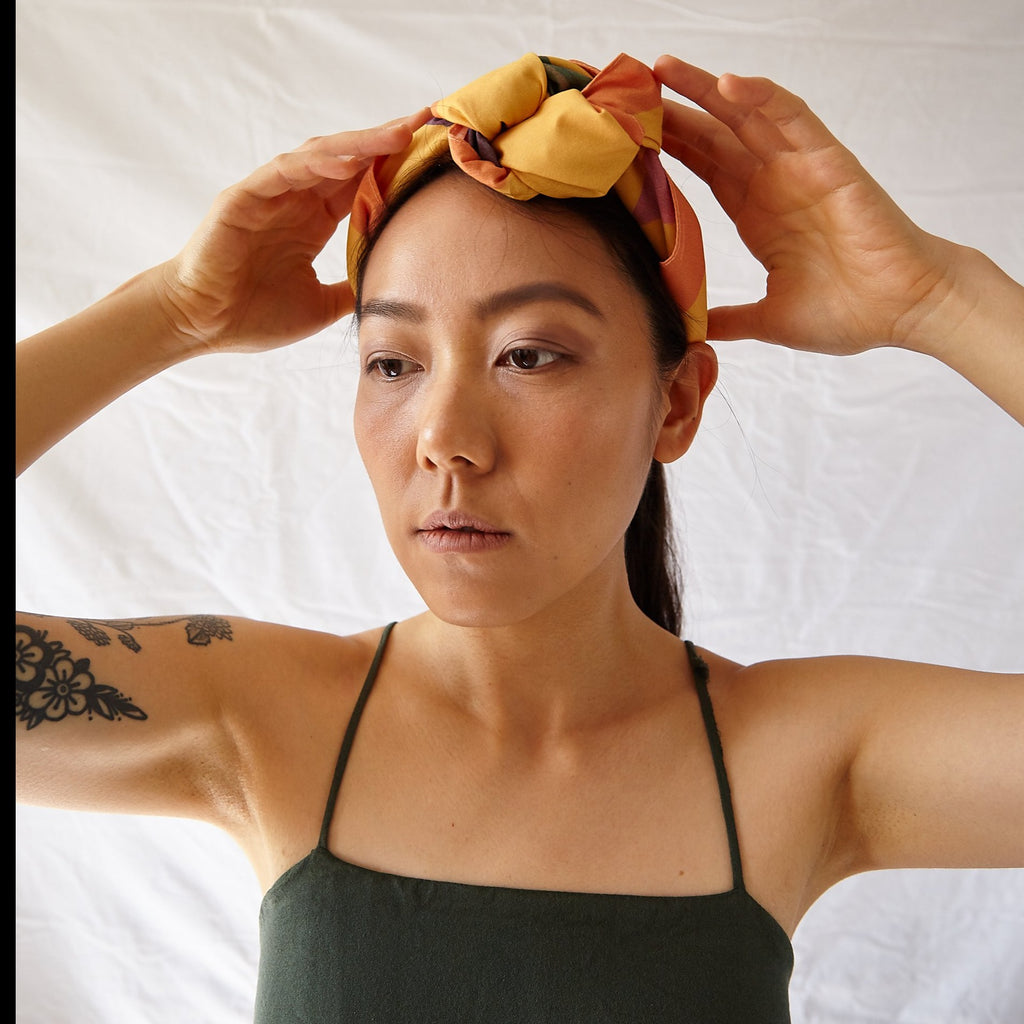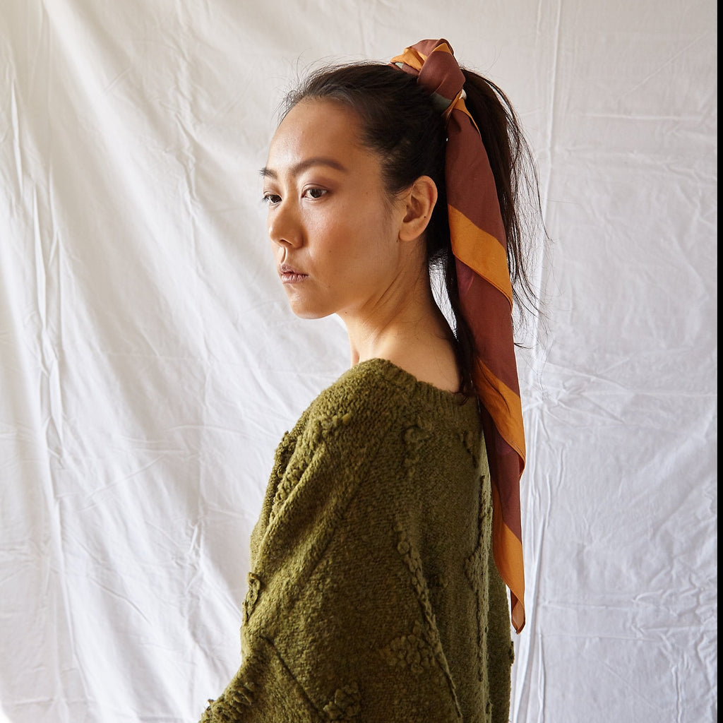 Project TrêsThe Karen scarf showcases a vibrant mix of floral prints, leaves, and other illustrative elements. Designed by Karen Suehiro, the piece comes in two color patterns. One with a fresh color palette and another one with warm tones. This piece is crafted from cotton and has a soft feel, making it easy to style. Its style is playful and elegant, and its fabrication process echoes Project Três's ethical principles. It can also be used as a decor piece.